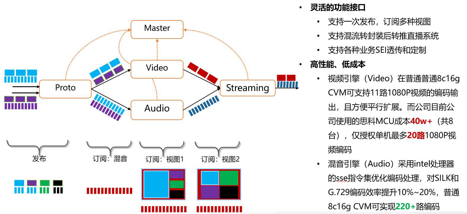 TRTC 并没有采用目前业内比较普遍的硬件 MCU 解决方案,因为这样的 MCU 硬件由于没有产业规模,往往单机价格都非常昂贵。为了节省成本,团队学习谷歌当年用廉价 PC 机组合搜索服务后台的思路,自研了一套基于指令加速的软件 MCU 系统,该系统可以运行于最普通的云主机上,从而将硬件成本从昂贵的特种服务器变成了具备规模化优势的云服务器,实现了成本上的大幅缩减。