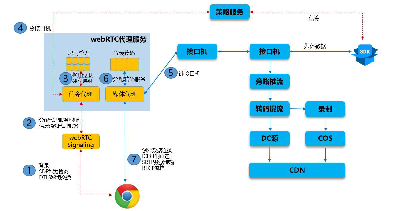 所以团队创新性地引入了一种技术方案绕开这种限制:即在云端引入了跟客户端 1v1 通信的镜像实例,这些镜像模块就相当于一个个在云端运行 WebRTC 的“假用户”,它们跟浏览器中的真实用户进行数据通信,但是会将接收到的数据进行实时“翻译”,转换成 TRTC 系统理解的数据格式,从而接入到了 TRTC 现有的系统中。