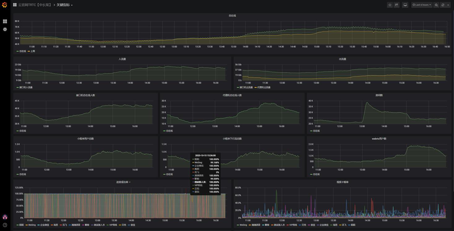 于此同时,作为一个千万级并发规模的云服务系统,各种实时监控更是少不了的。TRTC 监控系统分成大屏监控和仪表盘两个部分: