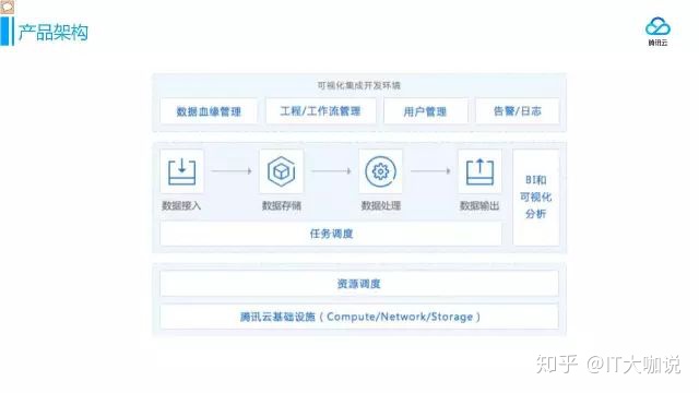 因为公有云上的用户需要简单,所以要有一个可视化的集成开发环境,在这环境中可以进行数据血缘管理、工程/工作流管理、用户管理和告警/日志。通过一些工具把数据导入到数据存储里面,然后对数据进行处理,最终输出数据。下层的任务和资源调度是用来调度用户的任务在各个资源上运行起来。底层就是腾讯云的基础设施。