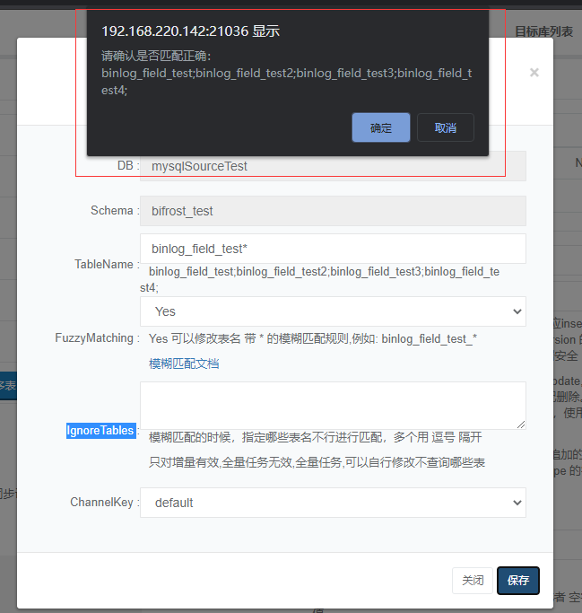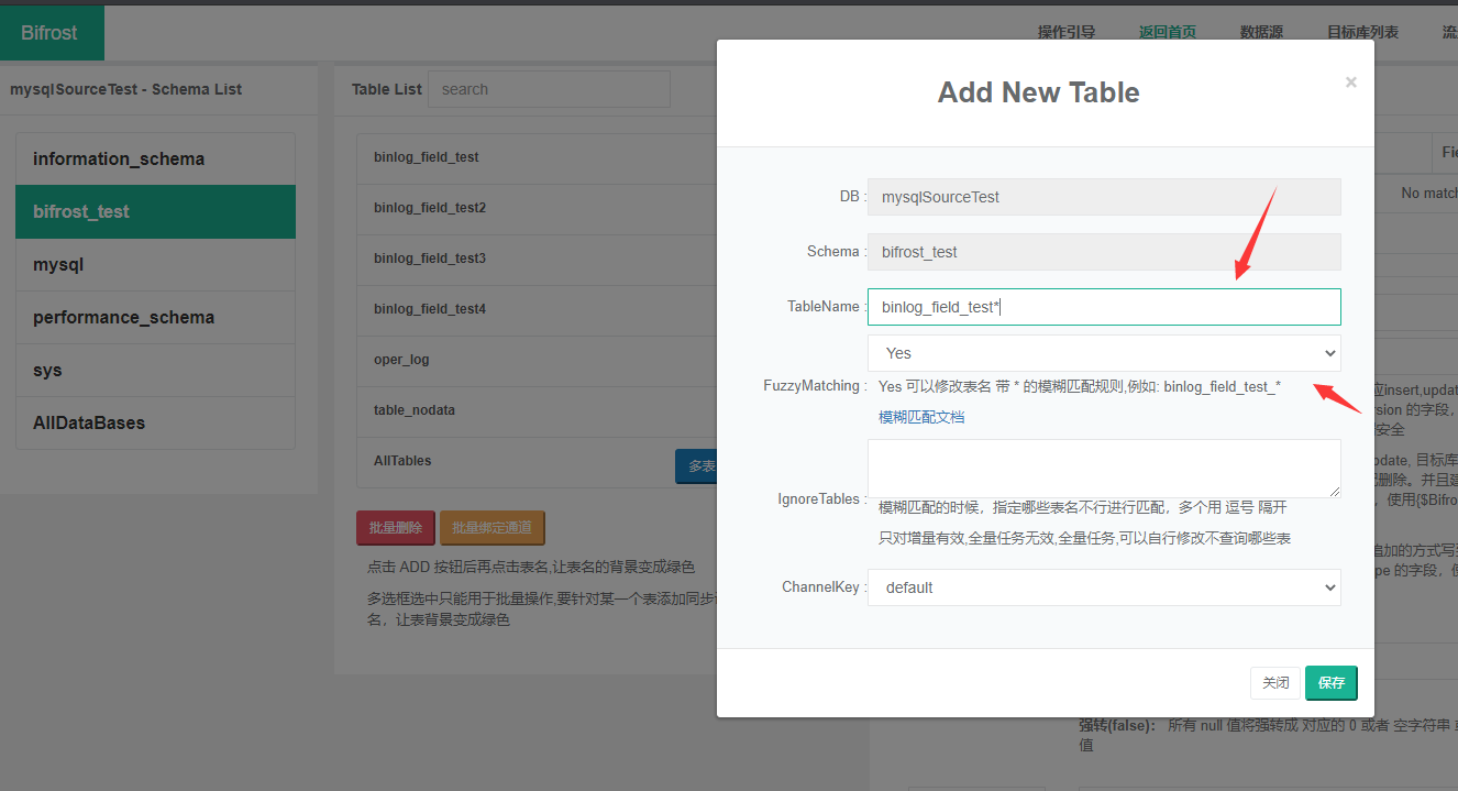 在 2.3.1 点击了保存 绑定 表和通道 等配置后,在 TableList 列表最下面,会自动新增了 一个 binlog_field_test* 虚拟表,这是模拟匹配表才会自动新增,假如不是模拟匹配的话,是不会新增虚拟表的