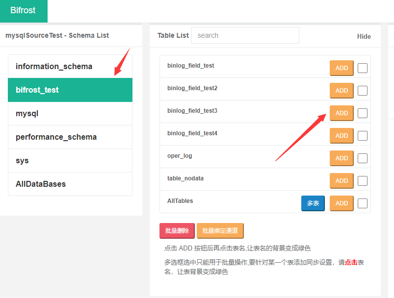 选择 其中一个binlog_field_test 前缀的表,并点击 其右边的 ADD 按钮