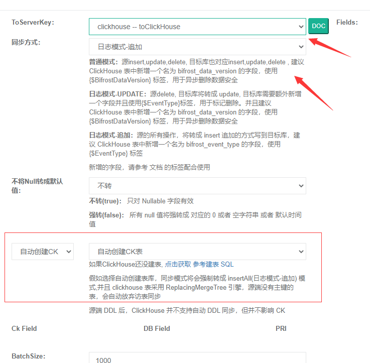 同步到 ClickHouse 有三种模式,其实管理系统也说得比较清楚了