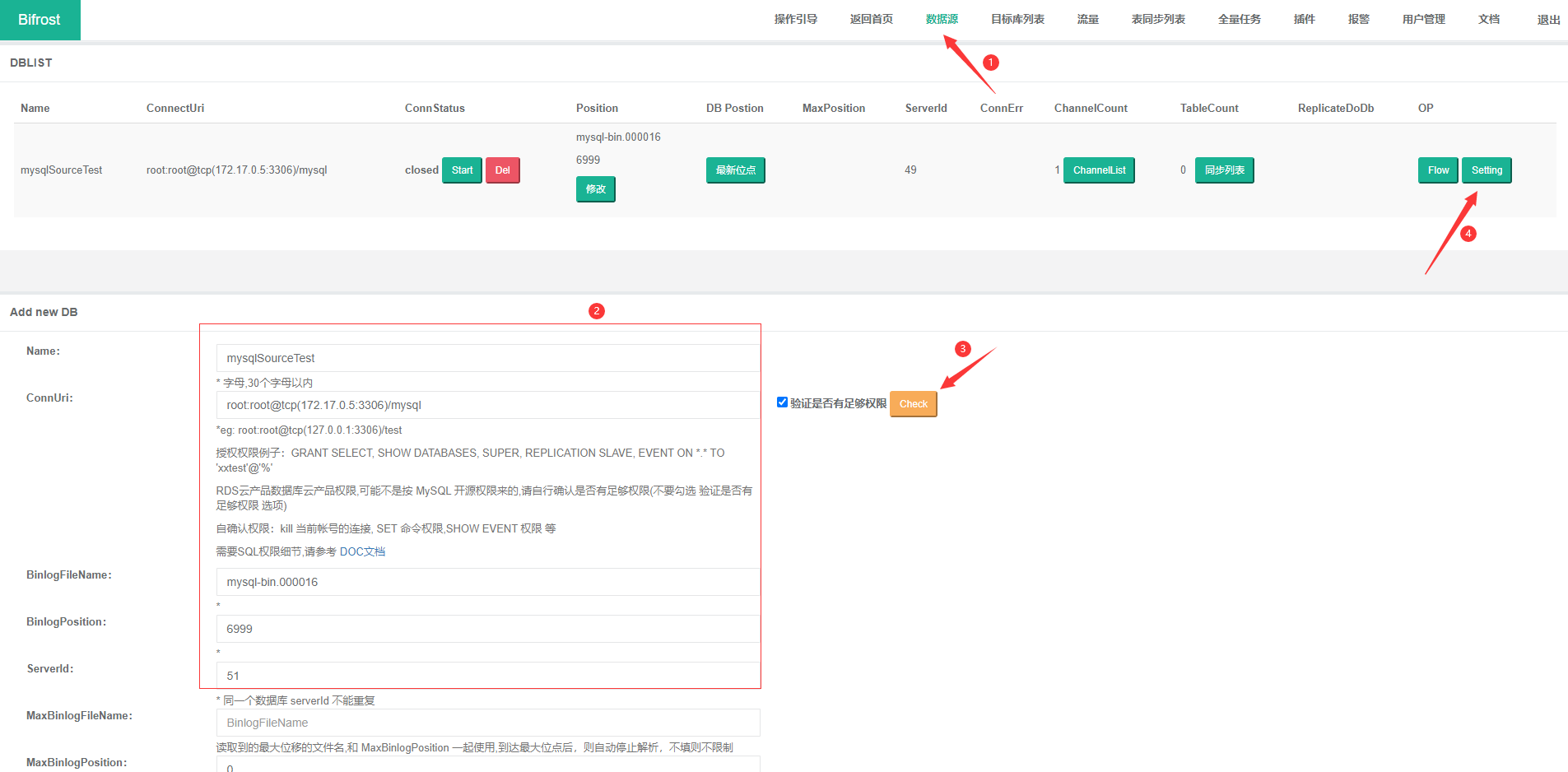 连接帐号需要Super等权限 ,可以参考 WIKI : https://wiki.xbifrost.com/data_source/add/