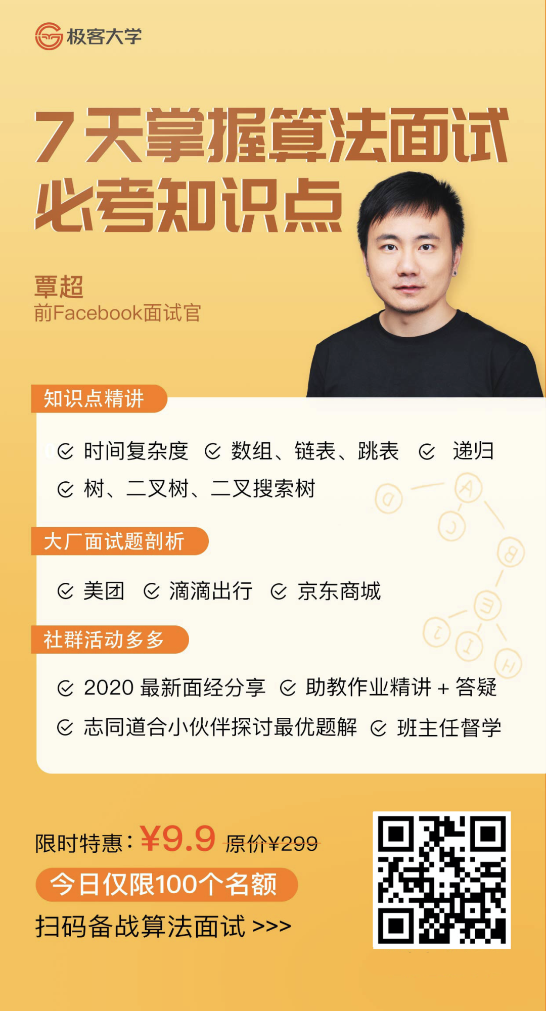 极客时间的算法训练营正好有个体验课的活动,讲师是前 Facebook 多年面试官覃超,会用 7 天带你掌握算法面试必考知识点,手把手带你了解企业的需求并接触到真实项目经验。建议算法根基不太稳的同学,仔细了解一下——7 天掌握算法面试必考知识点。