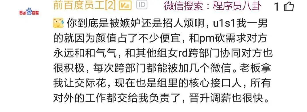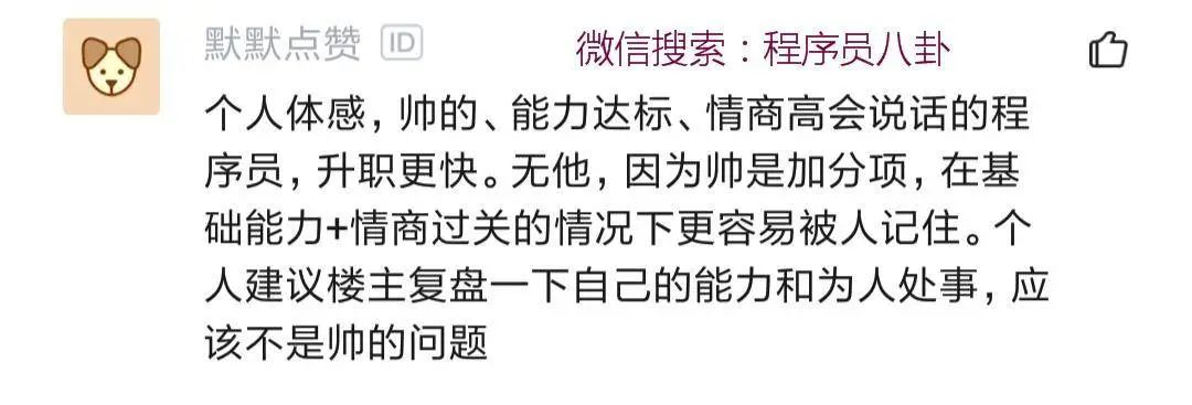 其他颜值高的程序员出来说自己因为颜值占了不少便宜,归根结底还是楼主做人做事有问题,毕竟谁不喜欢好看的人呢?工作这么枯燥,好看的人多养眼。