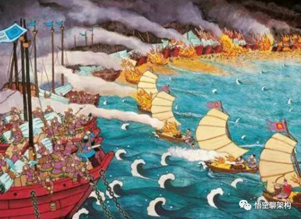 赤壁之战那天,火船乘风闯入曹军船阵,顿时一片火海。联军乘势攻击,曹军伤亡惨重,最后以联军大胜结束,成为了以少胜多的经典战役。