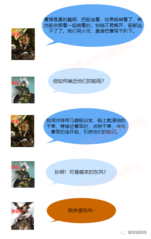 黄盖:曹操是真的蠢啊,把船连着,如果船烧着了,其他船会跟着一起烧着的。锁链不易解开,船都逃不了了。我们用火攻,直接把曹军干趴下。周瑜:但如何接近他们的船呢?黄盖:我用诈降带几艘船出发,船上载浸油的干草,等接近曹军时,点燃干草,冲向曹军的连环船,引燃他们的船只。周瑜:妙啊!可是哪来的东风?诸葛亮:我来借东风~