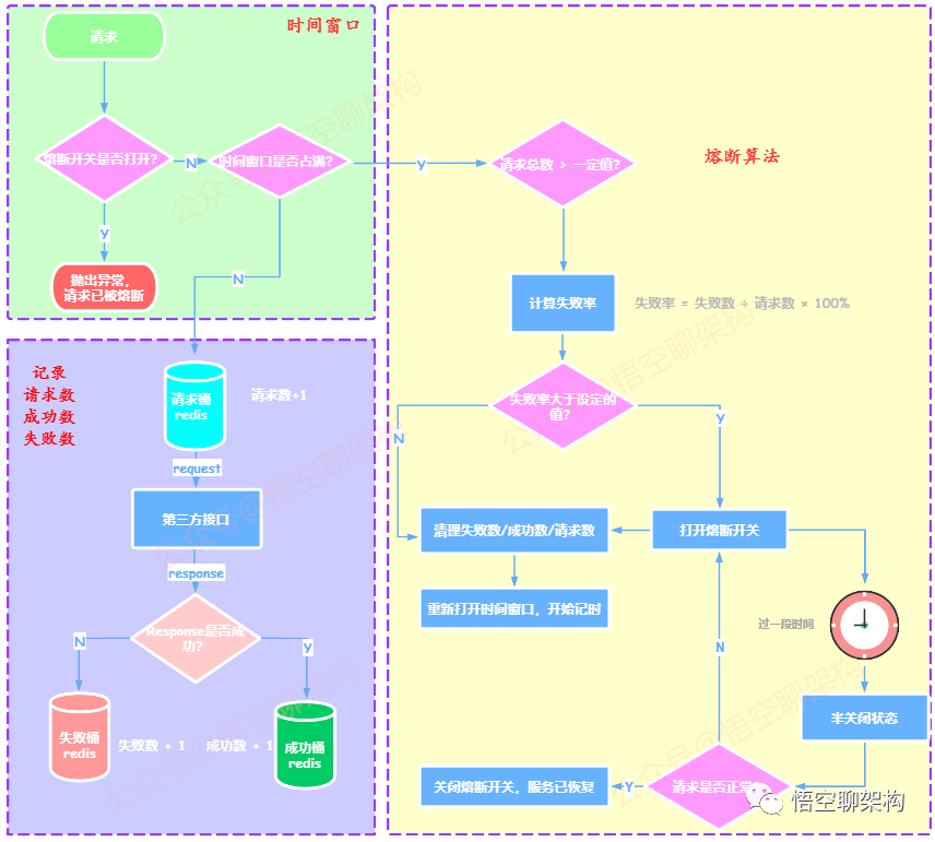 「熔断有个原则」 一段时间内,统计失败的次数或者失败请求的占比超过一定阈值,就进行熔断。
