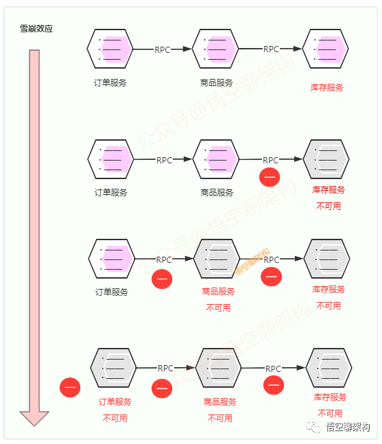 依赖库存服务,商品服务的超时和重试机制会被执行。商品服务新的调用不断产生,会导致商品服务的调用被大量积压,产生大量的调用等待和重试调用,慢慢耗尽商品服务的资源,比如内存,结果导致商品服务也宕机了。而订单服务也会重走商品服务的老路。结果就是三个服务