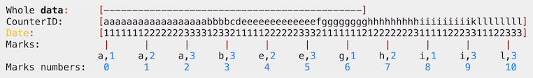 样例中的主键列为 CounterID、Date,这里按每 7 个值作为一个数据块,抽取生成了主键索引 Marks 部分。当用户查询 CounterID equal ‘h’ 的数据时,根据索引信息,只需要读取 Mark number 为 6 和 7 的两个数据块。