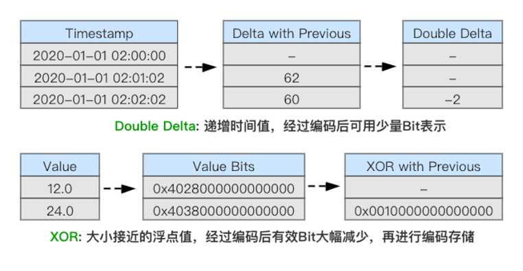 其中 DoubleDelta、Gorilla 是 Facebook 专为时间序数据而设计的编码算法,理论上在列存储环境下,可接近专用时序存储的压缩比,详细可参考 Gorilla 论文[5]。