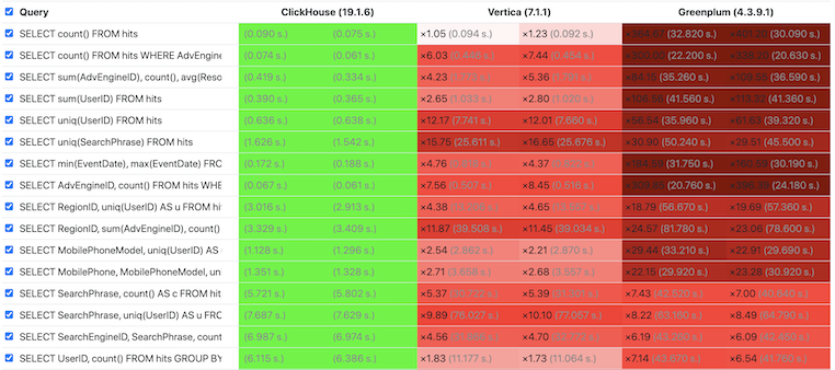 性能是衡量 OLAP 数据库的关键指标,我们可以通过 ClickHouse 官方测试结果[2] 感受下 ClickHouse 的极致性能,其中绿色代表性能最佳,红色代表性能较差,红色越深代表性能越弱。