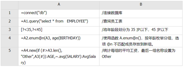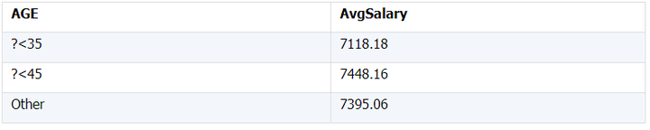 【例 10】 根据员工薪资表,按年龄条件 [小于 35 岁, 小于 45 岁] 将员工分组,统计平均工资,不满足条件的分到新组。员工薪资表部分数据如下: