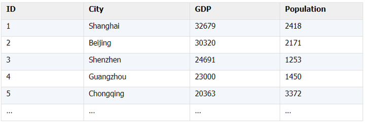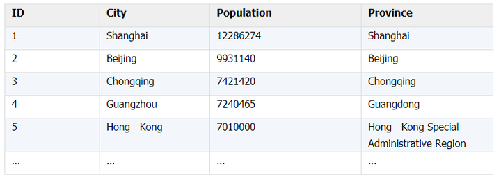 【例 9】 根据中国主要城市人口表,按人口将城市分类。中国主要城市人口表部分数据如下: