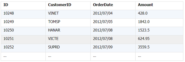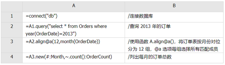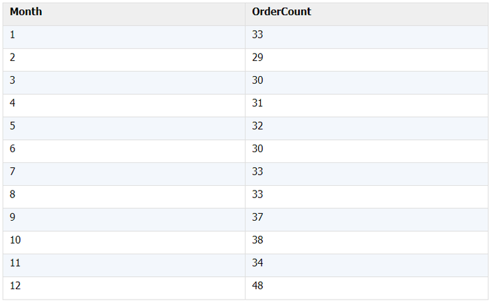 【例 5】 根据订单表,顺序列出 2013 年每月的订单总数。订单表部分数据如下: