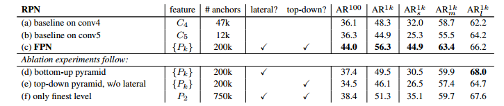 加入FPN的RPN网络的有效性如下表Table1。网络这些结果都是基于ResNet-50的。评价标准采用AR(Average Recall),AR右上角的100或1K表示每张图像有100或1000个anchor,AR的右下角s,m,l表示COCO数据集中object的大小分别是小,中,大。feature列的大括号{}表示每层独立预测。