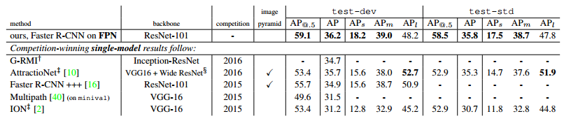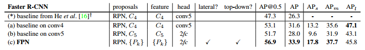 同理,将FPN用于Faster RCNN的实验结果如下表Table3。
