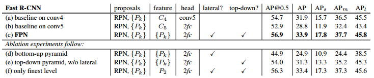 实验结果如下表Table2,这里是测试Fast R-CNN的检测效果,所以proposal是固定的(采用Table1(c)的做法)。与Table1的比较类似,(a)(b)(c)的对比证明在基于区域的目标卷积问题中,特征金字塔比单尺度特征更有效。(c)(f)的差距很小,作者认为原因是ROI pooling对于region的尺度并不敏感。因此并不能一概认为(f)这种特征融合的方式不好,博主个人认为要针对具体问题来看待,像上面在RPN网络中,可能(f)这种方式不大好,但是在Fast RCNN中就没那么明显。
