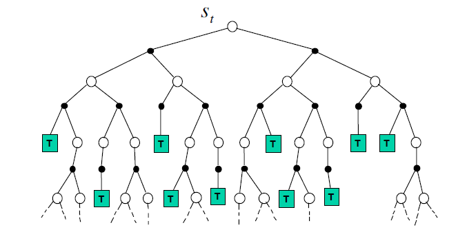 那么为什么要进行基于模拟的搜索呢?在这之前我们先看看最简单的前向搜索(forward search)。前向搜索算法从当前我们考虑的状态节点$S_t$开始考虑,怎么考虑呢?对该状态节点所有可能的动作进行扩展,建立一颗以$S_t$为根节点的搜索树,这个搜索树也是一个MDP,只是它是以当前状态为根节点,而不是以起始状态为根节点,所以也叫做sub-MDP。我们求解这个sub-MDP问题,然后得到$S_t$状态最应该采用的动作$A_t$。前向搜索的sub-MDP如下图: