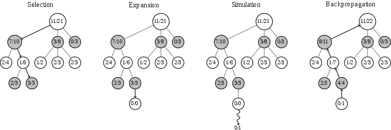对于MCTS的树结构,如果是最简单的方法,只需要在节点上保存状态对应的历史胜负记录。在每条边上保存采样的动作。这样MCTS的搜索需要走4步,如下图(图来自维基百科):