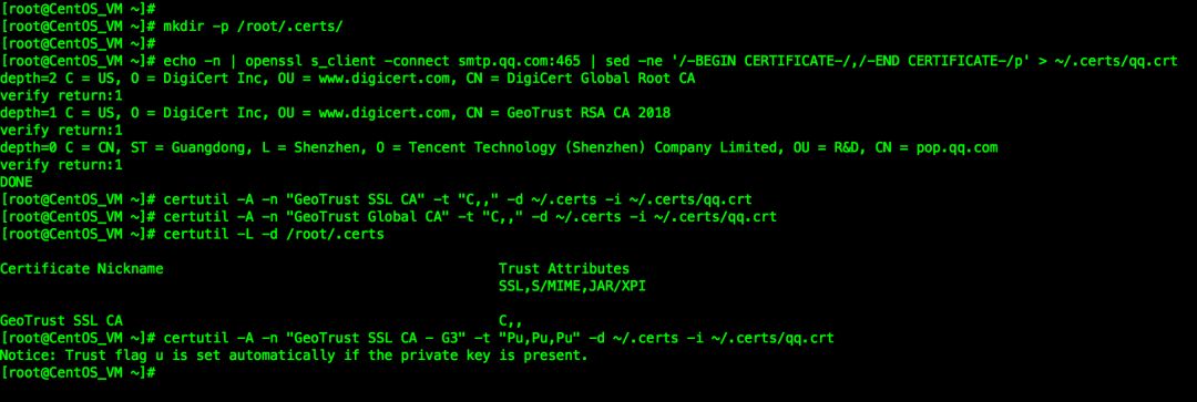 [root@localhost ~]# echo -n | openssl s_client -connect smtp.qq.com:465 | sed -ne '/-BEGIN CERTIFICATE-/,/-END CERTIFICATE-/p' > ~/.certs/qq.crt