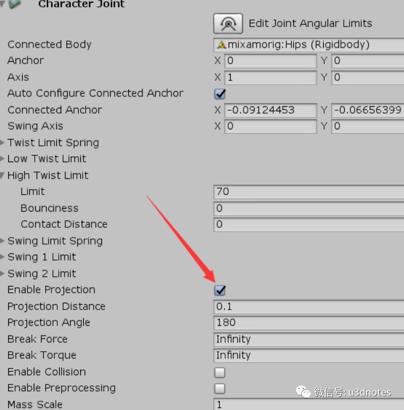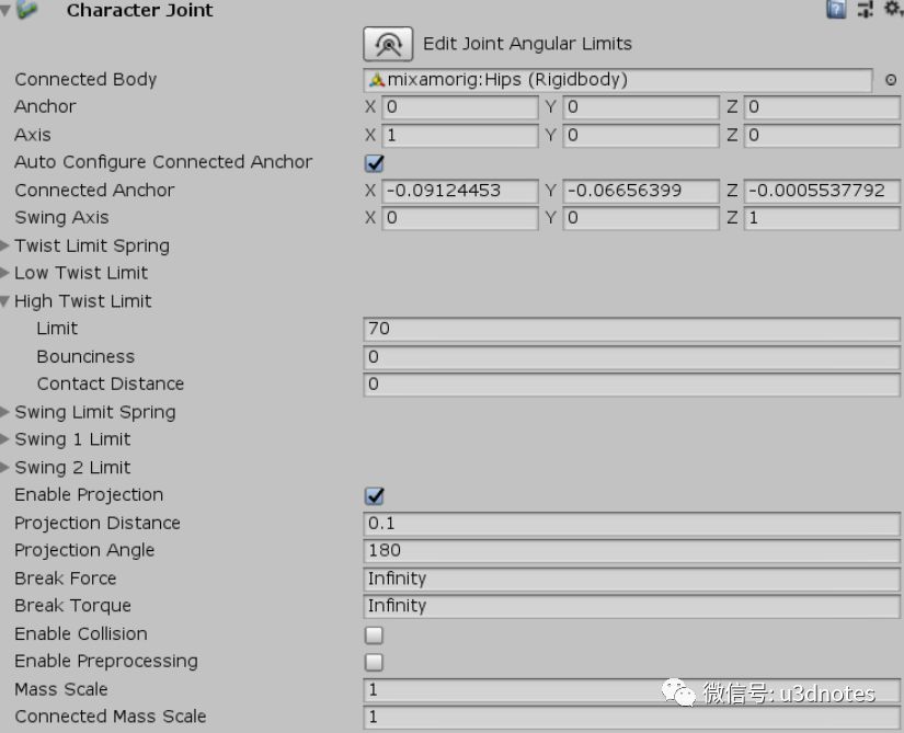 创建完成后,可以发现模型中的每个所选部位中多了一个Rigibody,一个Collider和一个Character Joint组件,在Joint面板里可以调节转动限制等