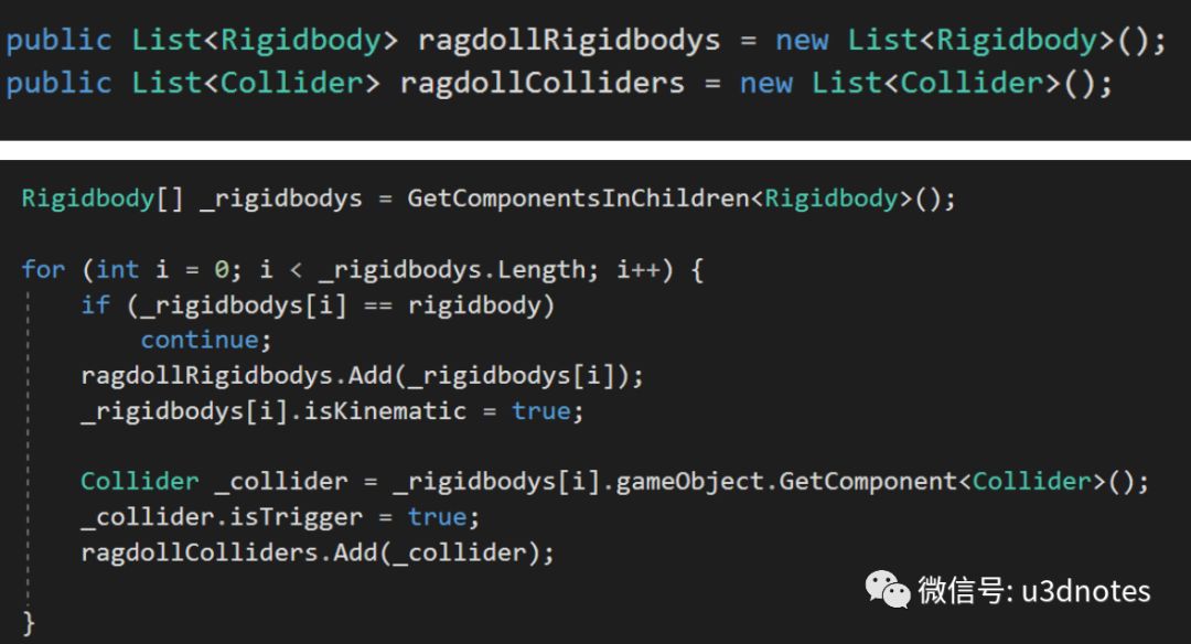 我的做法是使用GetComponentsInChildren函数获得所有刚体,再通过每个刚体获取这个部位上的Collider,用两个List将他们存储起来。就可以方便的设置isKinematic和isTrigger