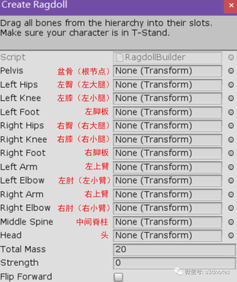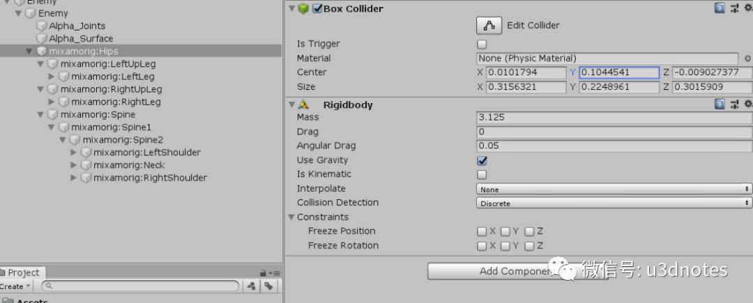 这里要注意的一个坑点是,root节点是没有Character Joint的,当你找不到root节点时,没有Character Joint但是添加了Box Collider和Rigibody的就是root节点