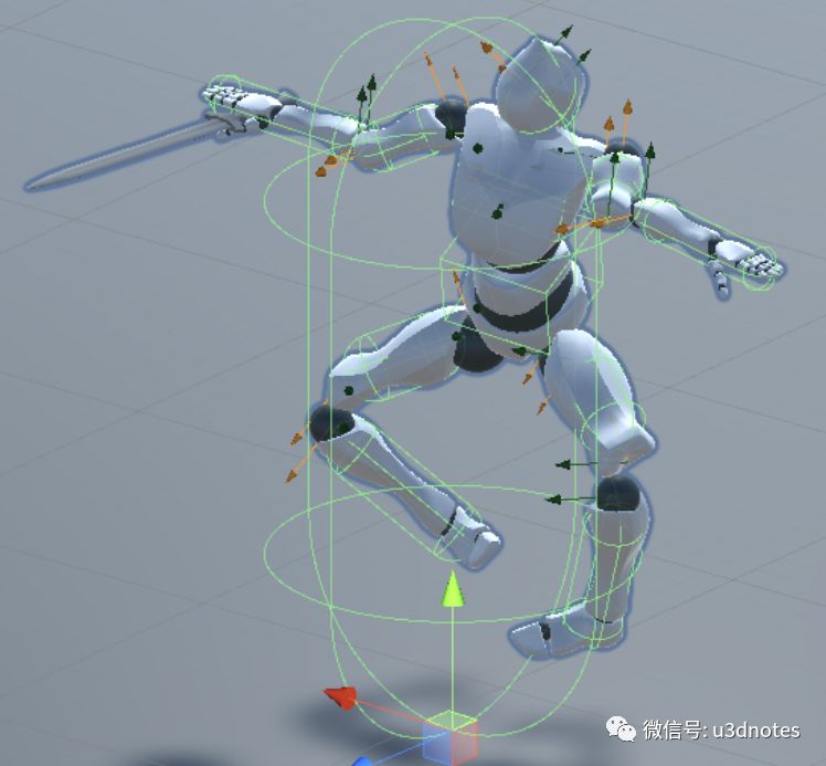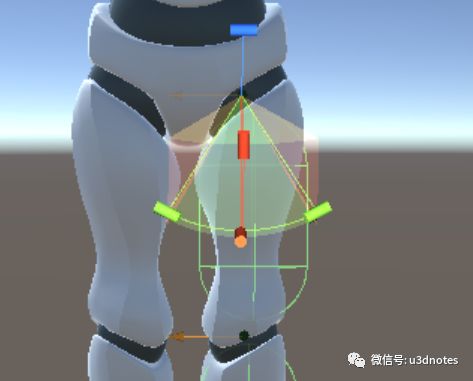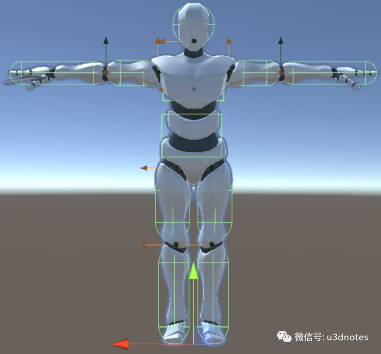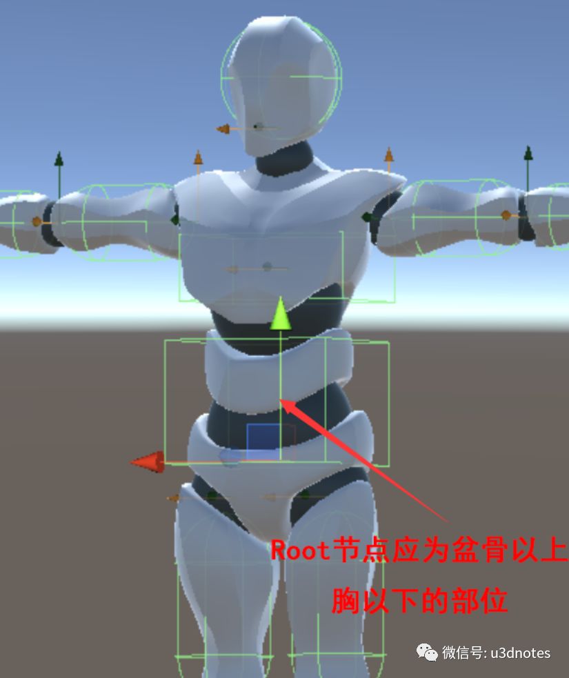 root节点应在这个位置,不熟悉朋友有可能将盆骨附近Pelvis 与 胸部附近Middle Spine的两个Collider互换位置,或者重叠,这将导致整个人物的抽搐,蒙皮拉伸