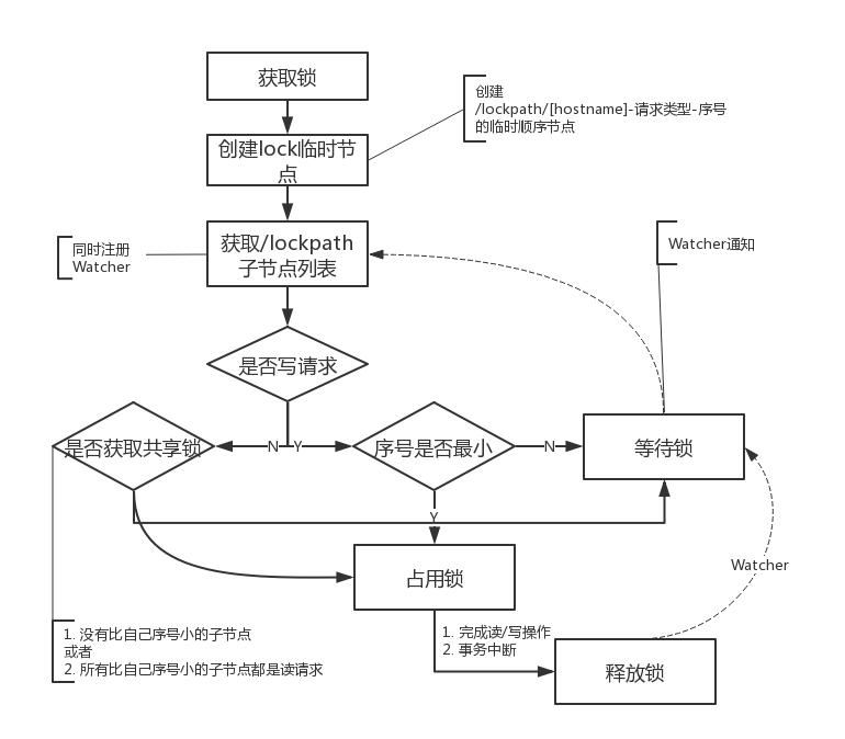 3.1)对于读请求:1. 如果没有比自己序号更小的子节点,或者比自己序号小的子节点都是读请求,那么表明自己已经成功获取到了共享锁,同时开始执行读取逻辑 2. 如果有比自己序号小的子节点有写请求,那么等待 3.