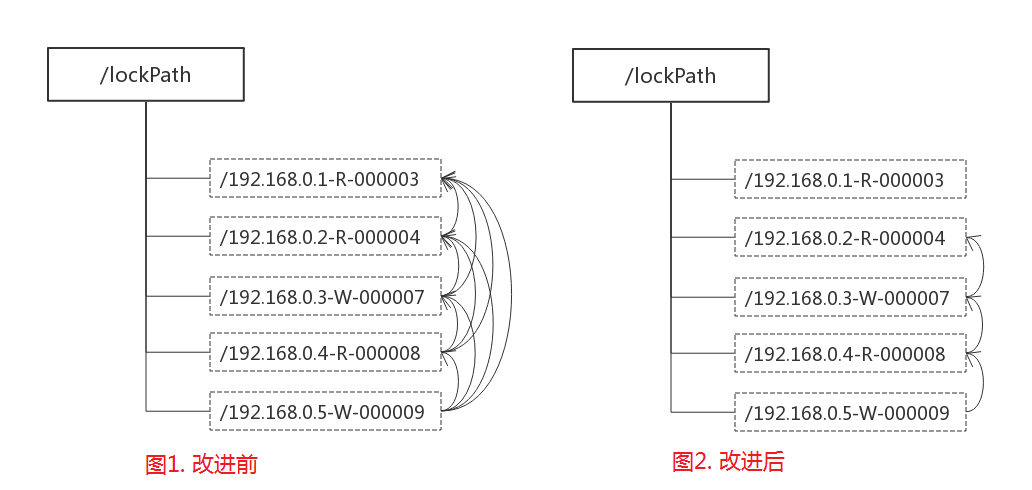 然而,这些重复操作很多都是 “无用的”,实际上每个锁竞争者只需要关注序号比自己小的那个节点是否存在即可