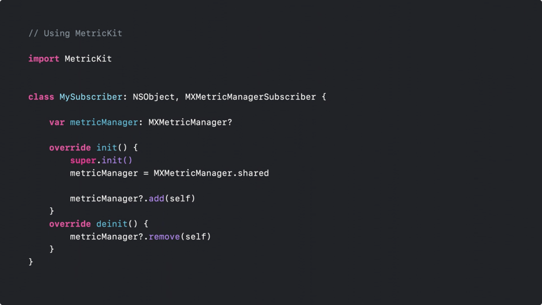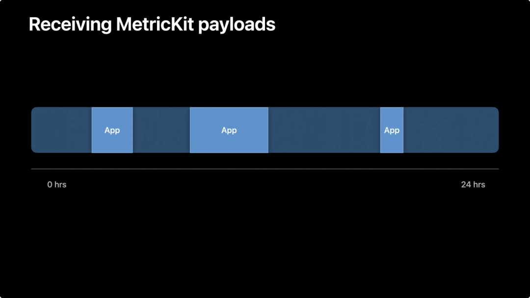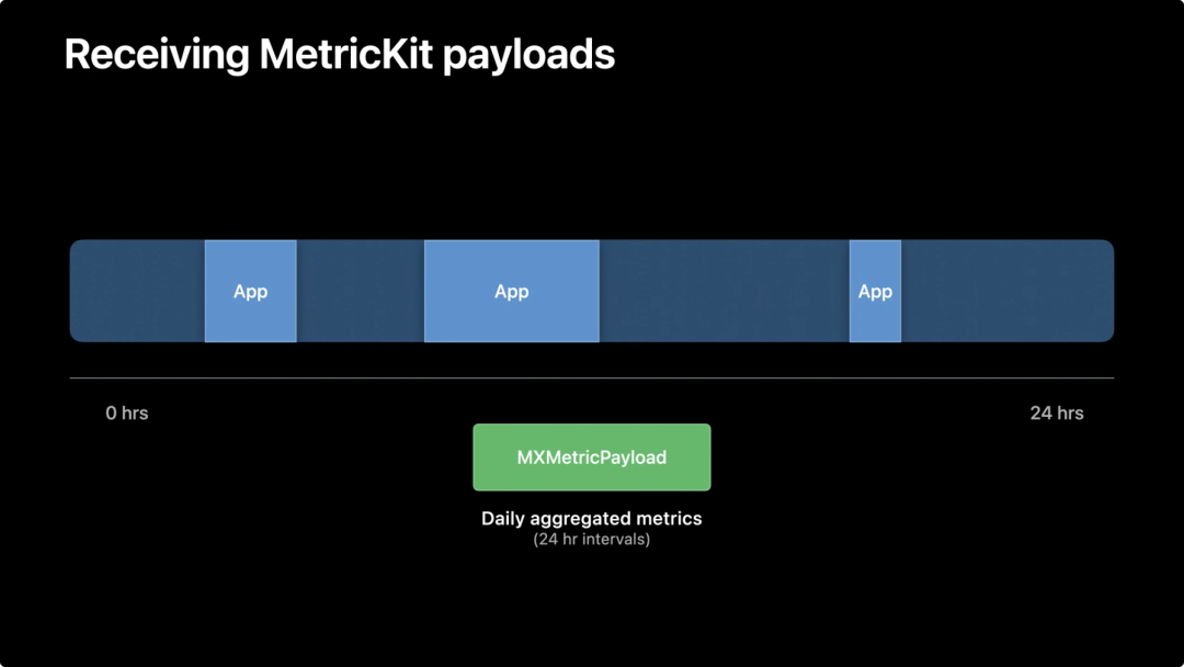 MetricKit 是苹果 iOS13 推出的框架,他会在一天结束后,将过去 24 小时内收集的性能数据归集在一起,并在下一次 App 启动时,通过 delegate 方法回调给我们。