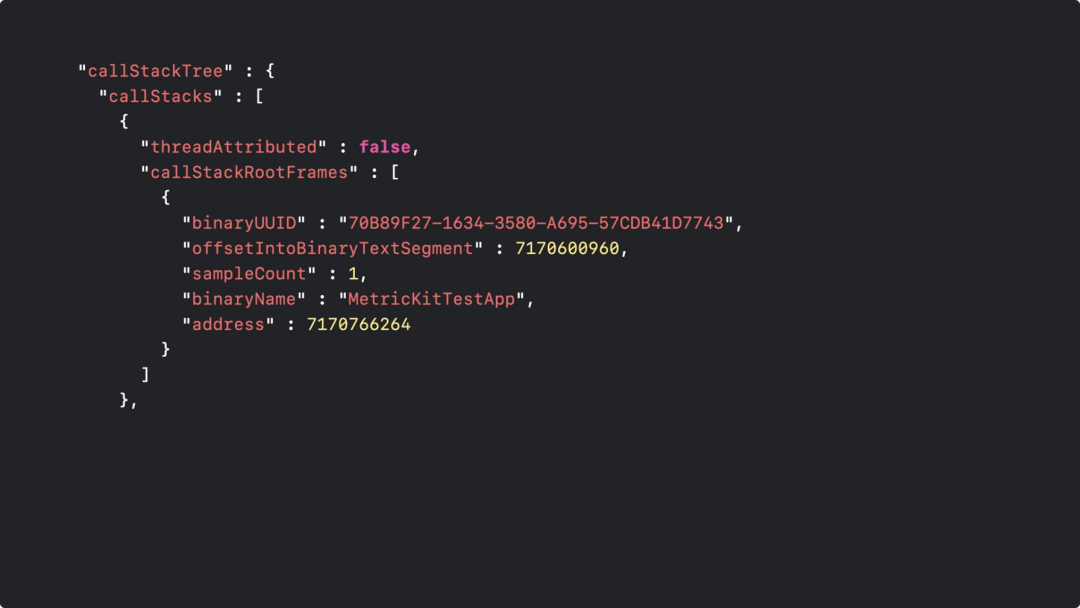 MXCallStackTree 封装的调用栈并没有经过符号化,旨在用于设备外处理,非 debug 用。转换成 JSON 后如下所示: