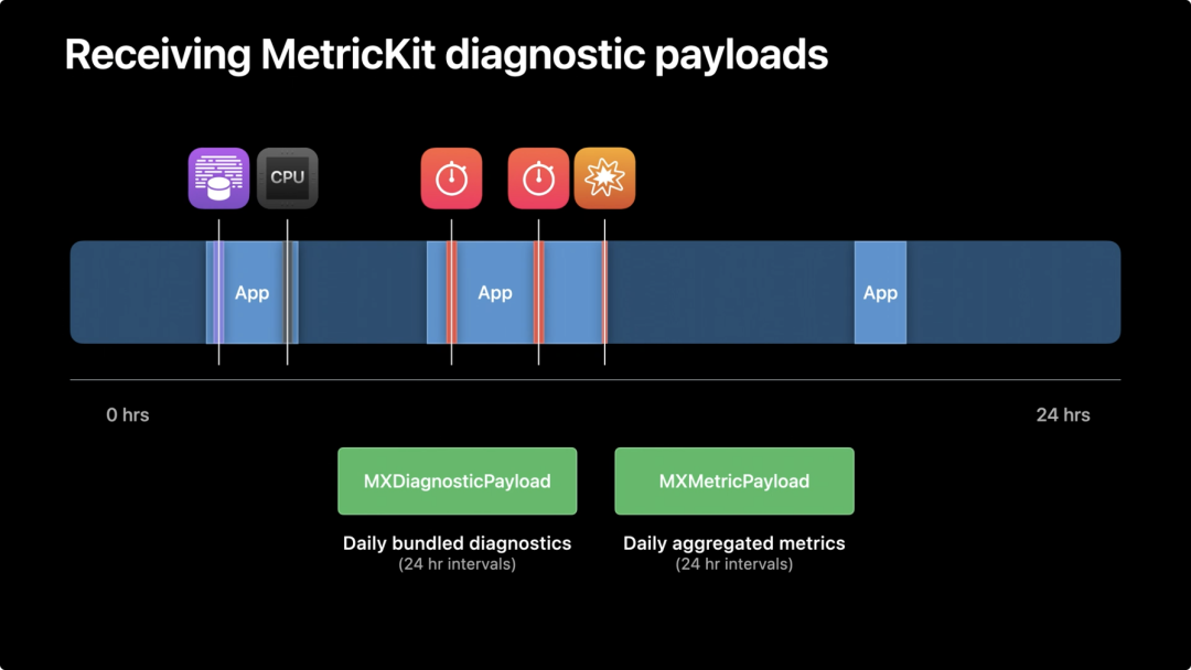 MetricKit 会在用户使用 App 的时候同步收集诊断信息,然后每天结束的时候将他们打包成 MXDiagnosticPayload 给到我们。这样我们就拥有了同一个时间段的性能数据和诊断数据。