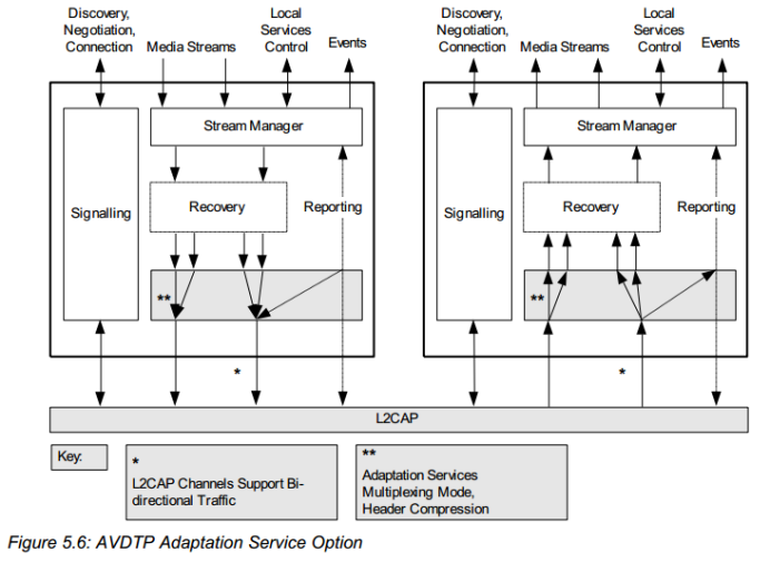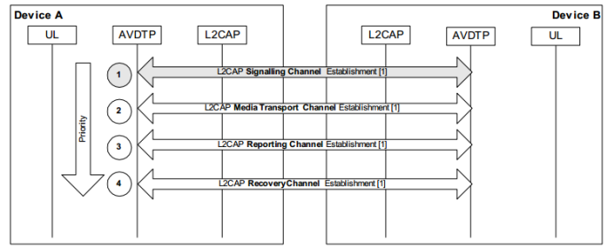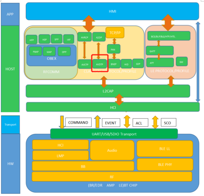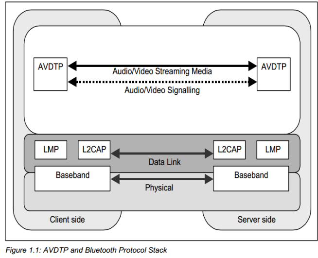 AVDTP( A/V Distribution Transport Protocol)就是音视频分布传输协议,主要用于传输音频/视频数据。在整个协议栈的架构图如下: