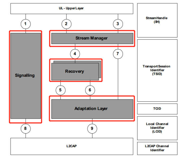 在流配置过程中,INT分配了tsid和tcid并通知ACP。避免在多设备配置中发生冲突为了减小其宽度,将TSID和TCID的范围限制在连接上在一对设备之间。建立流程不一定打开一个新的传输(L2CAP)通道。相反,它可以将一个新的传输会话映射到现有的L2CAP信道。这是通过引用一个现有的TCID来实现的。
