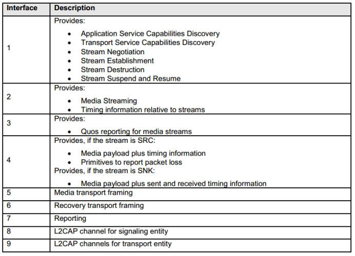 Application and Transport Service Capabilities:应用服务和传输服务的功能。应用服务功能比如协商、配置音源设备的codec,内容保护系统等;传输服务能力比如数据报文的分割和重组,数据包的防丢检测等等。