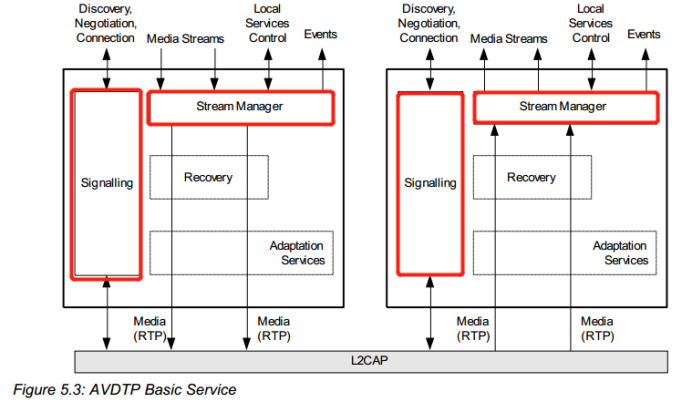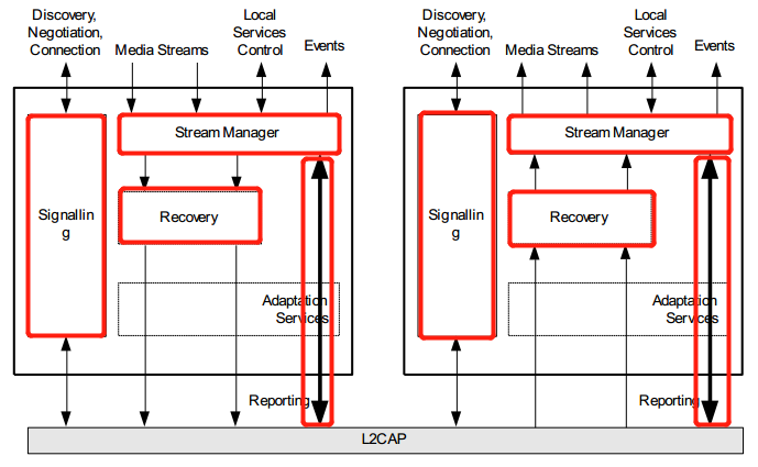 可以看到上图架构红框内就是AVDTP协议,AVDTP的底层是L2CAP层。