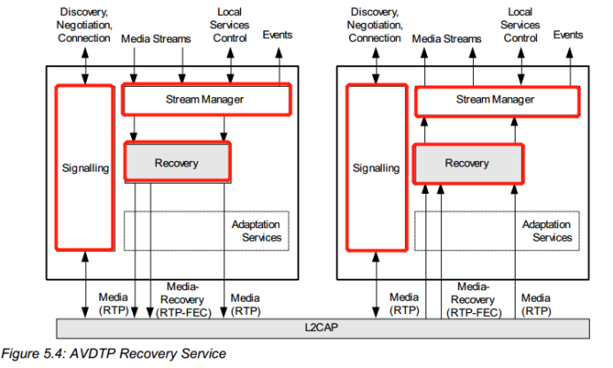 在多路复用模式中,属于同一种或属于某一种的多个传输会话不同的流,可以共享一个公共传输(L2CAP)通道。此外,一个L2CAP数据包可以包含属于相同或不同传输的多个数据包会话。因此,每个封装头都需要媒体/报告/恢复包。包含在这个头中的TSID允许正确SNK设备上数据包的路由。