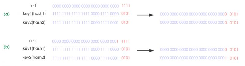 //hash碰撞后高位为0,放入低Hash值的链表中