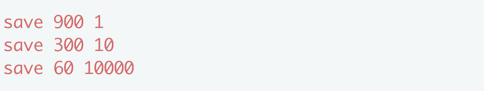 其中 m 代表秒数,n 代表次数,放在一起表示的是 m 秒内发生 n 次变化时,会触发 bgsave。