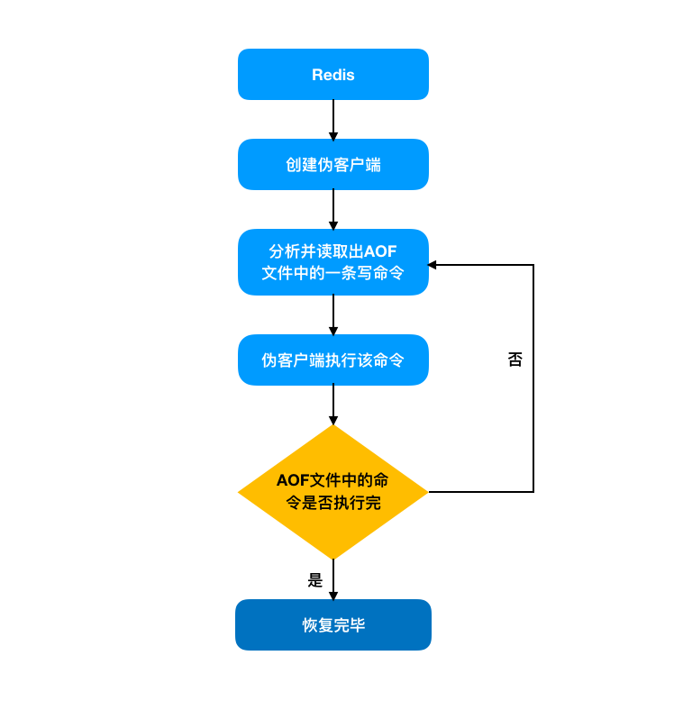 同样地,我们也需要对 AOF 文件进行恢复。和 RBD 不同的是,Redis 中是通过创建一个不带网络连接的伪客户端来进行实现的。为什么要创建伪客户端呢?你想想 AOF 文件中的数据格式,都是由命令组成的。通过客户端直接执行每条命令就可以将数据进行恢复。