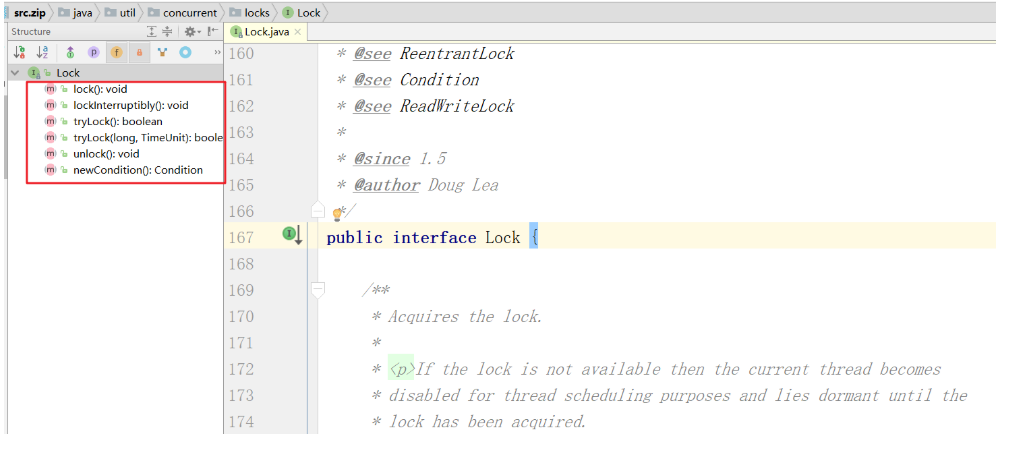 接下来让我们看一下,Lock接口的源码截图,除了看图以外,我建议你打开jdk的源码,看一看Lock接口源码,里面有很详细的源码注释,这是一种挺好的学习方式。