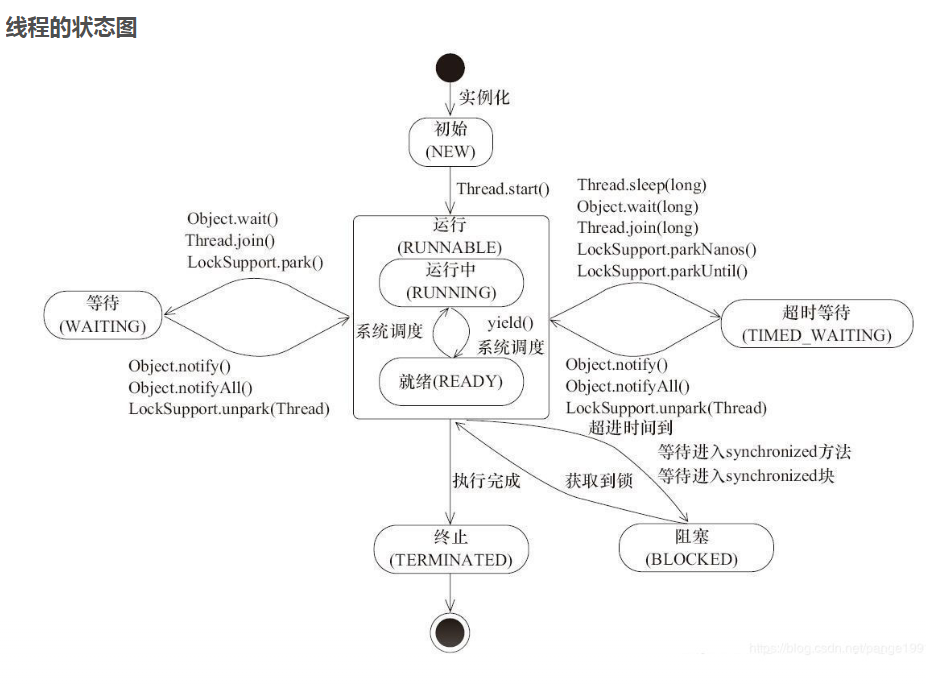 ps:初始(new)、运行(runnable)、阻塞(blocked)、等待(waiting)、超时等待(timed_waiting)、终止(terminated)