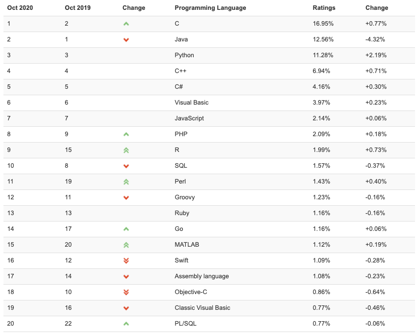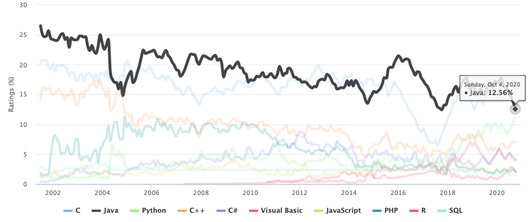 而 Java 恰恰相反,自从 2001 年以来,Java 正在接近它的历史最低点,Python 和 Java 之间的差距不断的缩小,相差仅为 1.3%。自从 TIOBE 指数开始以来,C 和 Java 一直占据着前两名的位置。