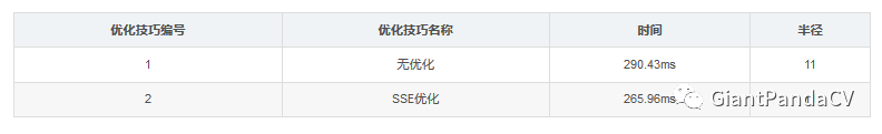普通版和SSE优化版(没有最后一个颜色通道转换的优化)完整的代码可以在我的github找到,现在我给出我的时间测试表,Corei7 8770单核,图片分辨率为4032*3024。