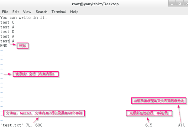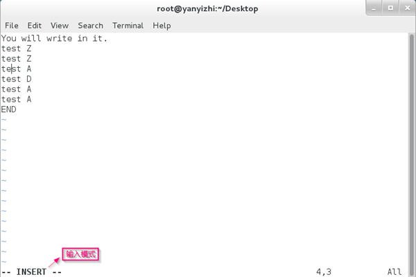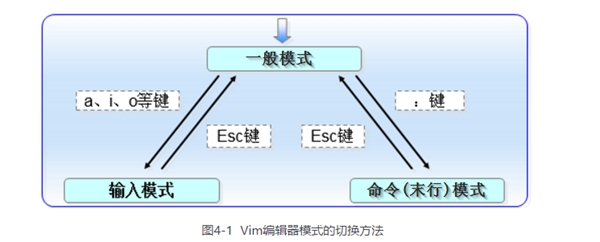 输入模式:从一般模式切换到输入模式可通过a、i、o等键(退出输入模式,返回一般模式:Esc键)