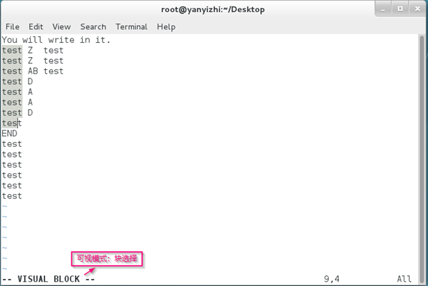 Visual可视模式:可通过v或V从一般模式切换到可视模式(退出可视模式,返回一般模式:Esc键)