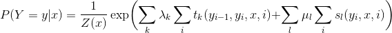 ##线性链条件随机场 给定一个线性链条件随机场$P(Y|X)$,当观测序列为$x=x_1x_2...$时,状态序列为 $y=y_1y_2...$的概率可写为(实际上应该写为$P(Y=y|x;θ)$,参数被省略了)